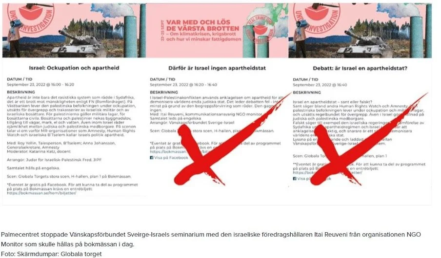 På skärmdumparna kan man dock tydligt se att det var Vänskapsförbundet Sverige-Israel som skulle vara arrangör för ett 20 minutersanförande om varför Israel inte är en apartheidstat.